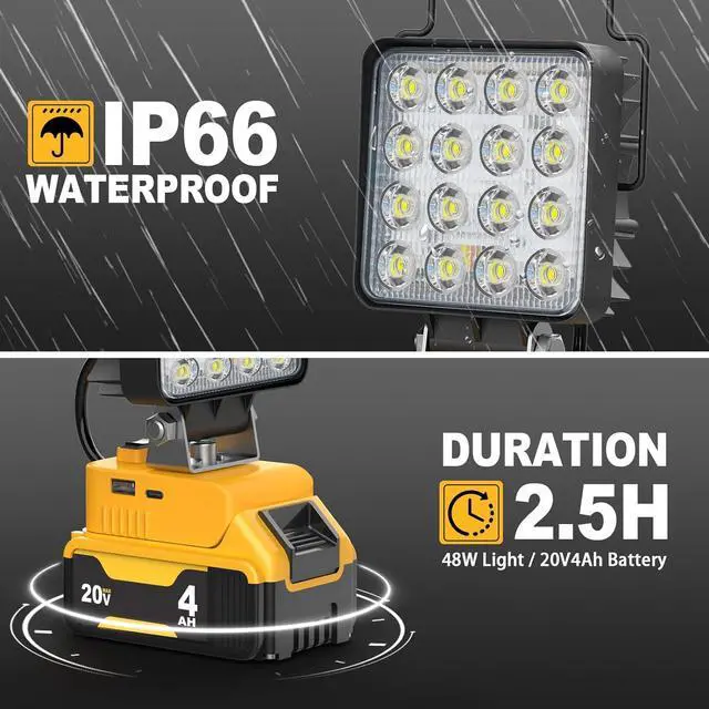 ROTATABLE & CHARGING - The cordless outdoor lights has 140° rotatable design. It can adapt to different work scenarios and lighting needs in different directions. It also has a USB-A & USB-C charging port, which can be used as a power bank to charge your mobile phone, Bluetooth headsets, tablets, Bluetooth speakers or other devices while working. It's a great led work light option for dewalt 20v battery tool bag or box.