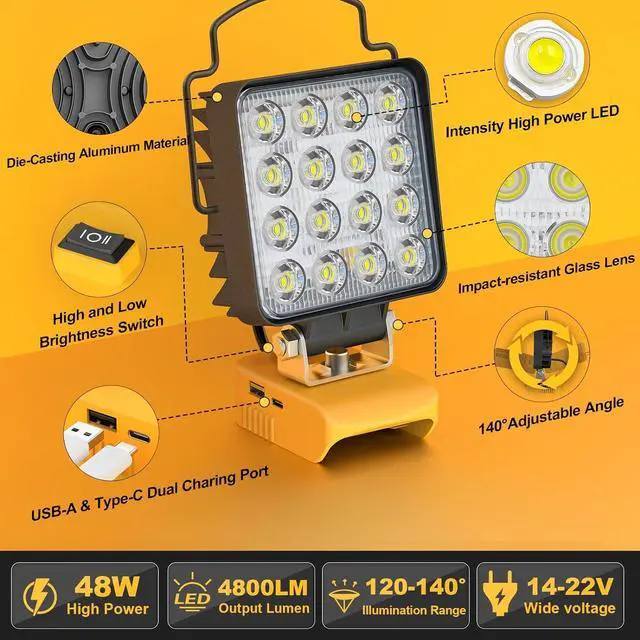 SAFETY DESIGN -The USB codlress construction LED Work light is designed with one 2 gears switch, which can control the high and low brightness separately, to meet the different scenes. This battery powered shop light has a built-in low-voltage protection panel to protect your battery from damage. It will automatically cut off the power when the voltage drops below 14.5V.