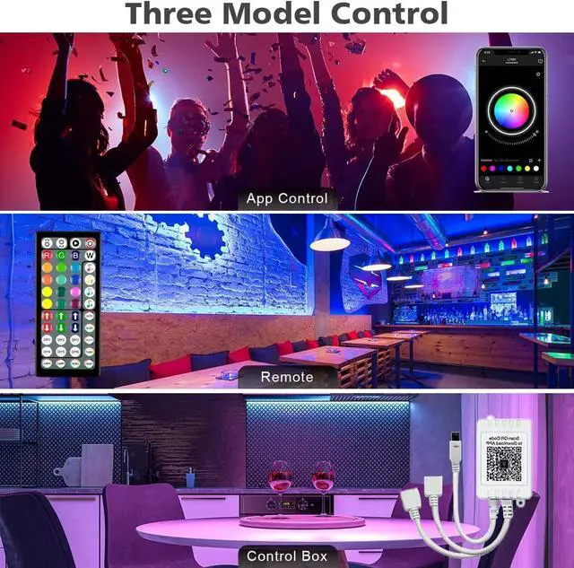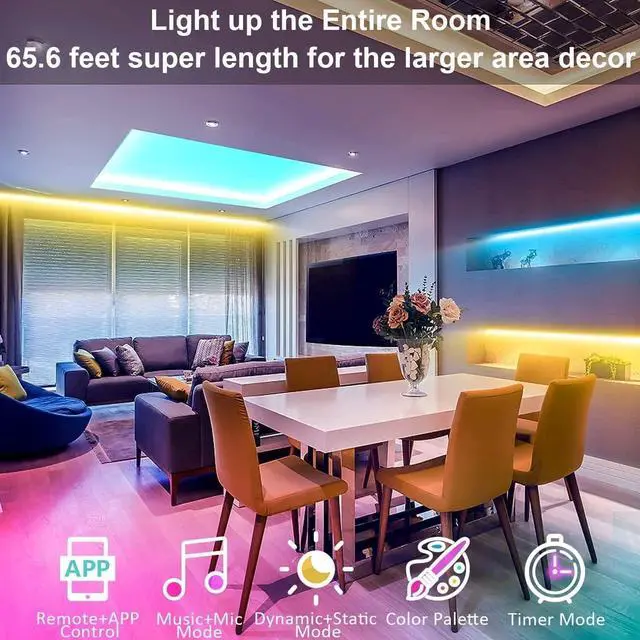 Led lights 65.6 ft room decor, 1. This led light strips SMD RGB Leds in 100feet with dimmer and brightness controls. 2. Using double layer copper on PCB board to keep the mixed colors more even. 3. 3M self-adhesive tape can be fit on any dry and flat surface