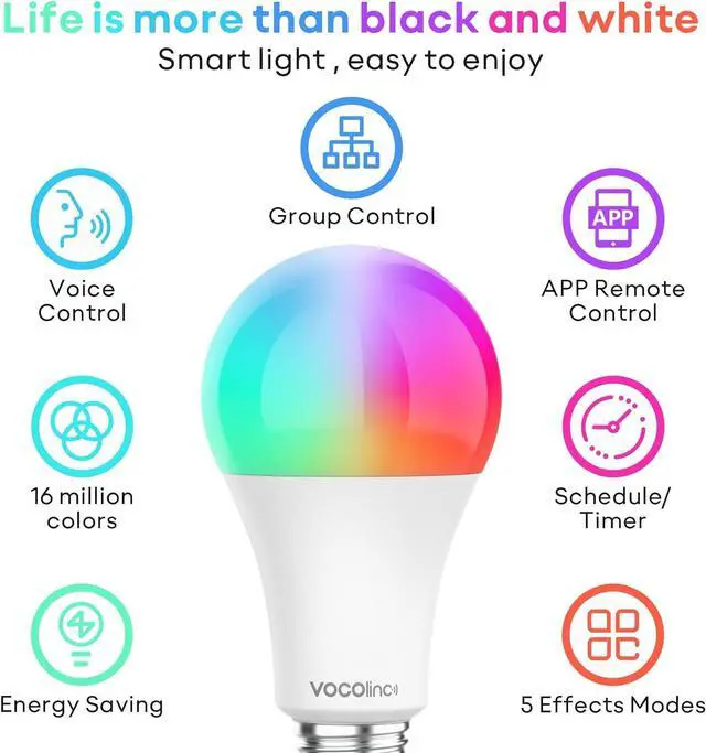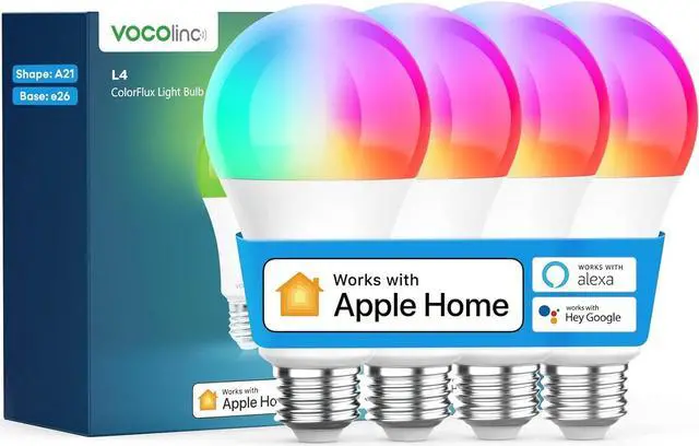 VOCOlinc Smart Light Bulb Works with Apple Homekit, Alexa, Google Home, Dimmable WiFi Smart Bulbs, 850 Lumens, E26 LED Smart Bulb 60 Watt Equivalent, A21, 2200K-7000K RGBW, 9.5W, 4 Pack