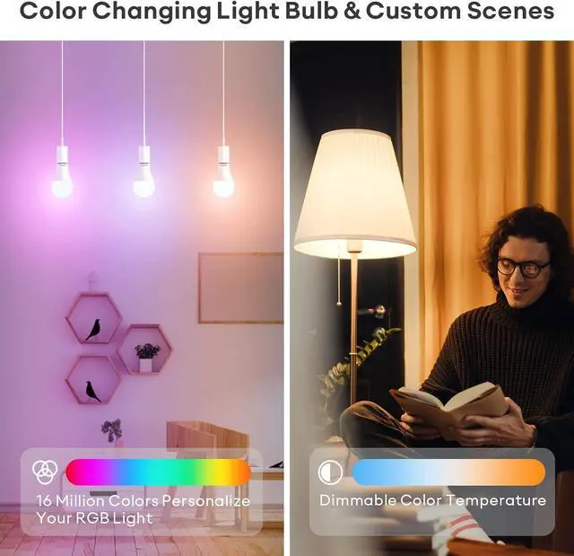 Full Color Changing Bulb: Dimmable smart LED light bulb support 16 million colors from warm white to cool white (2200K-7000K). Set your bulb to automatically adjust its color temperature to match natural light patterns from dawn to dusk. Perfect for decorating your house for festival, such as Halloween, Christmas.