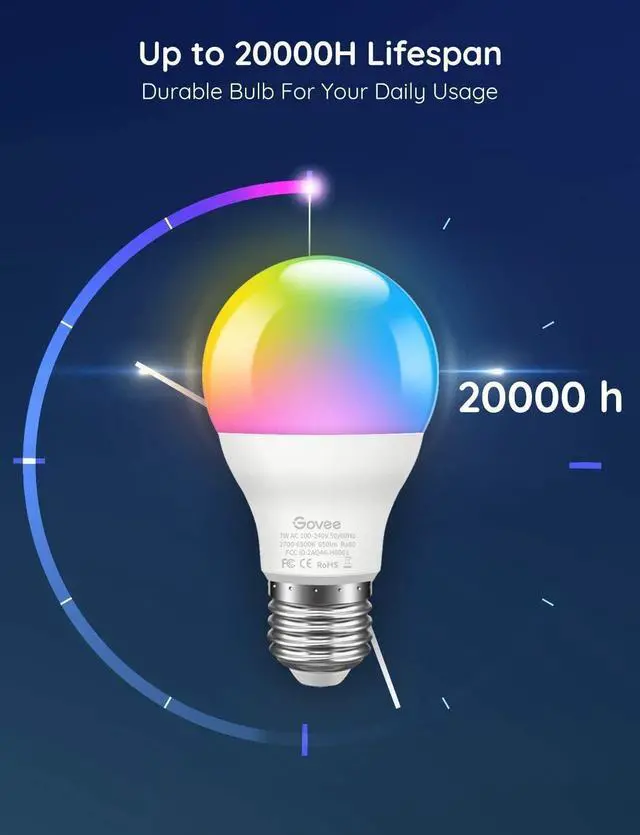 Energy Saving: Substitute for 60 watt bulbs. Our govee light bulb's lifetime up to 20000 hours. It is widely used in decorative atmosphere places such as bedrooms, entertainment, courtyard, and table lamps.