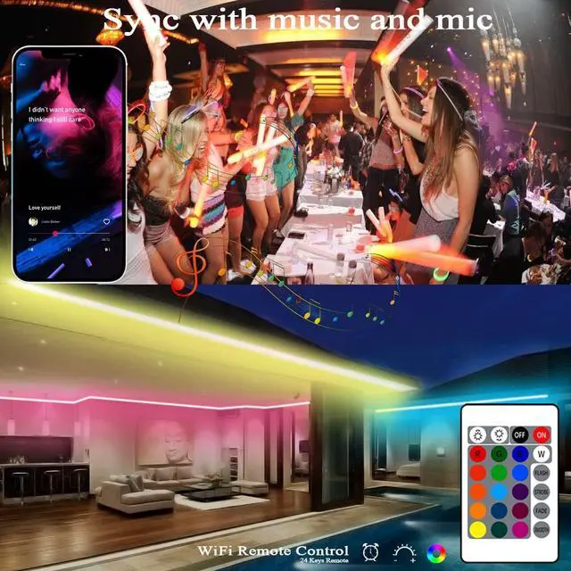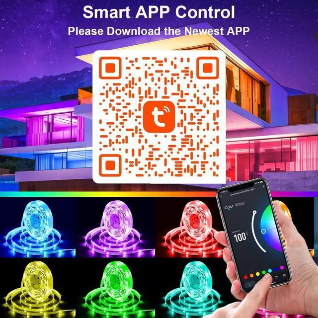 Powerful APP control interfaceScan the QR code on the picture (Please download the newest TUYA App) for control. Various color modes, multiple scene modes, brightness adjustment, timer, and music sync (sensing music from inside and outside the phone) (5G is not supported)