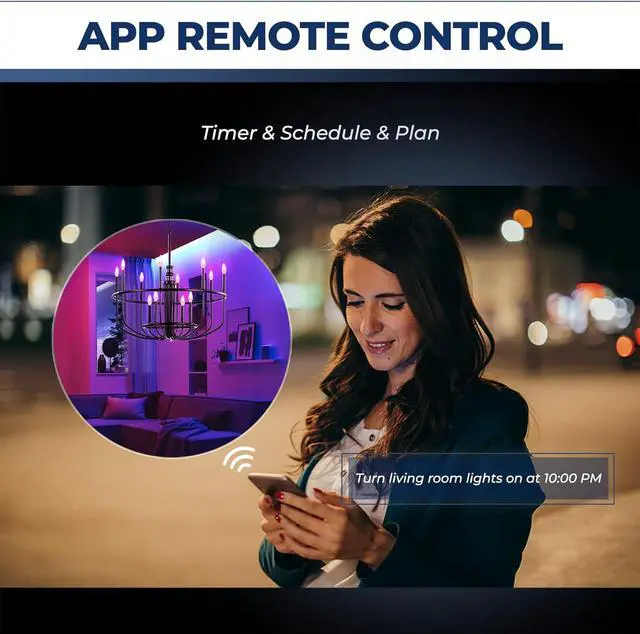 SMART SCHEDULING: Automate your lighting with the touch of a button using the Smart Life App. These candelabra smart bulbs can be set to a schedule or timer. Control smart light bulbs separately or in a group for a customized experience that works for you and your family. With these E12 LED bulbs, you can turn the lights on/off, change colors, or dim the lights remotely using your mobile phone. Please don't dim smart light bulbs with your dimmer switch.