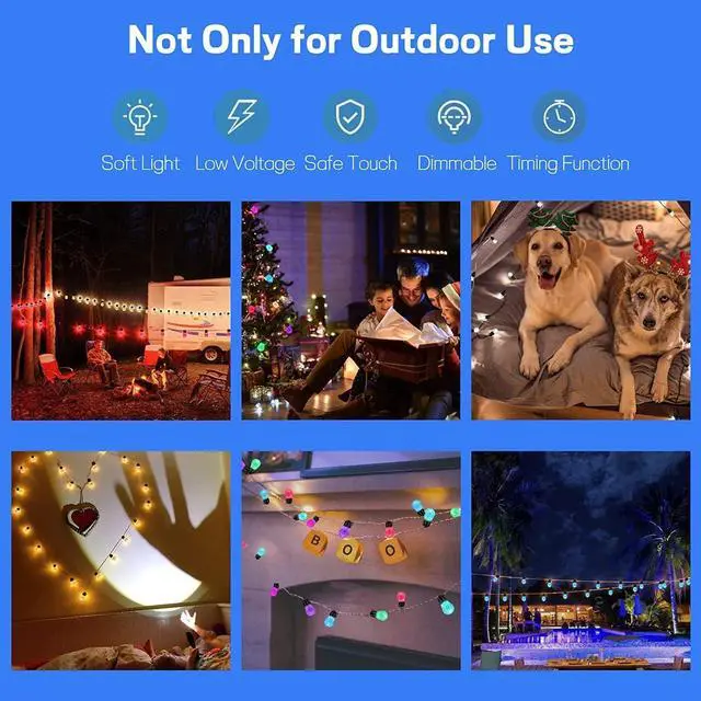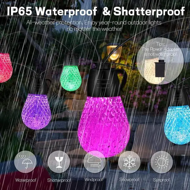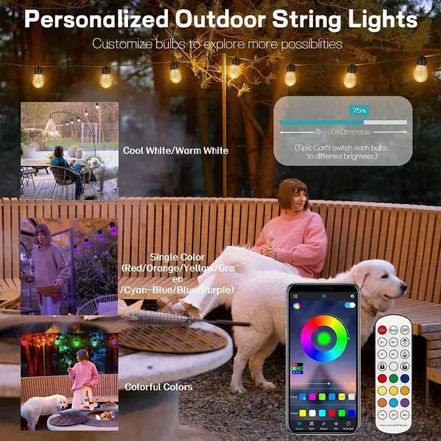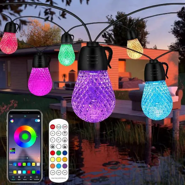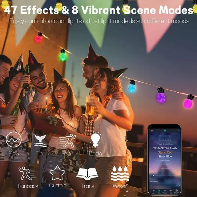 Smart App & Remote Control- Manage String Lights for Outside with Magic Lantern App or pair with remote (within a range of 15 meters) for power the lights on/off, 1-100% dimmable, color changing, 47 static lighting effects, 8 mode, sync to music and timing function. (Tips: LED Outdoor String Lights connect to the app via Bluetooth. )