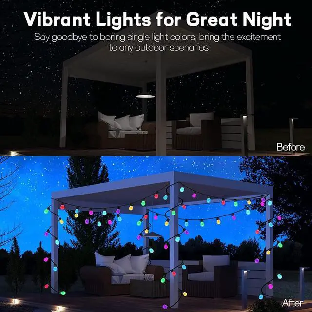 RGBW Light Effect- 2023 Upgraded Version, Gaoxun 49ft Outdoor String Lights with 16 millions of vibrant colors, 8 dynamic scene modes, enhance personalized holiday outdoor look with vibrant colors and help your patio stand out.