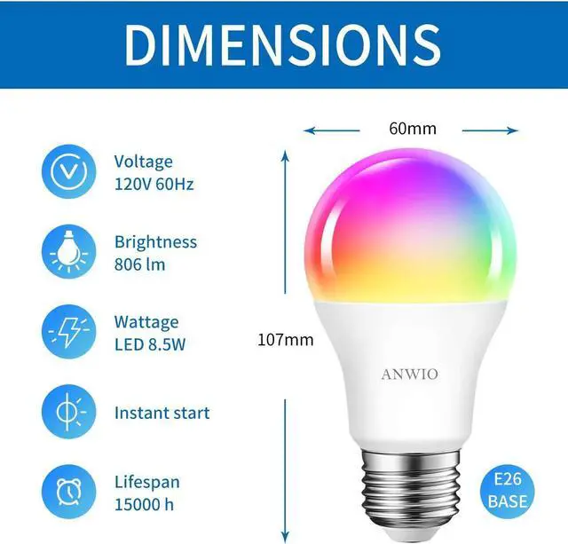 Voice Control: ANWIO Smart bulb 4 Pack compatible with Alexa Echo and Google Home Assistant, control the wifi bulb via your voice, No hub required. (e. g. Alexa, set the bedroom to purple)