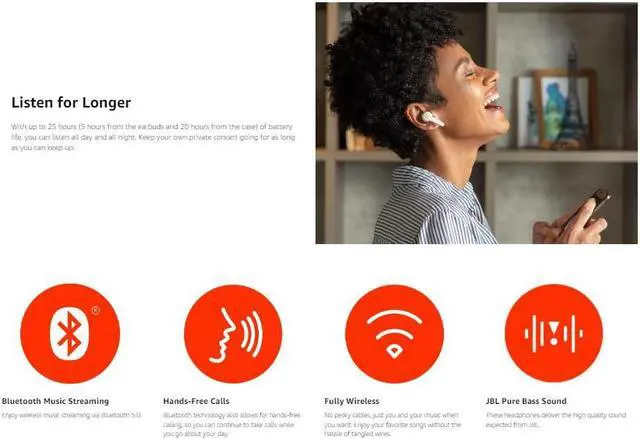 JBL PURE BASS SOUND: Powering festivals and concerts around the world for decades, now JBL brings your own world to life with incredible Pure Bass sound in these wireless earbuds.