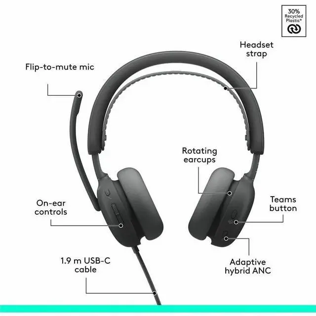 Remote management through Logitech Sync provides insights regarding usage and enables silent updates without user interruption. It's also designed for sustainability and product longevity, including easily replaceable components for extended use and recycled plastics, fabric, and magnets. It's a headset you'll feel good about.