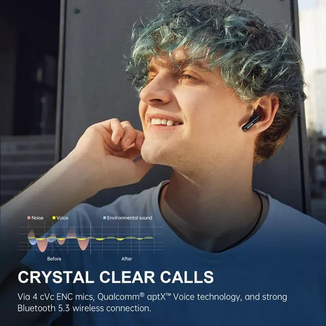 These advanced mics, combined with Qualcomm® aptX Voice technology, eliminate background noise for clear, distortion-free calls, even in noisy environments. Designed for active lifestyles, these IP54 waterproof earbuds offer durability and reliability, allowing you to enjoy your favorite tunes during workouts or outdoor adventures without worry. With their ergonomic semi-in-ear design and comfortable fit, they stay securely in place, providing hours of comfortable wear.