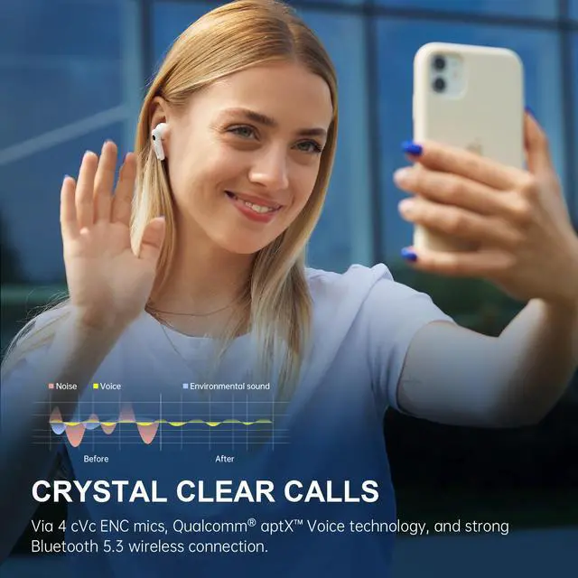 These advanced mics, combined with Qualcomm® aptX Voice technology, eliminate background noise for clear, distortion-free calls, even in noisy environments. Designed for active lifestyles, these IP54 waterproof earbuds offer durability and reliability, allowing you to enjoy your favorite tunes during workouts or outdoor adventures without worry. With their ergonomic semi-in-ear design and comfortable fit, they stay securely in place, providing hours of comfortable wear.