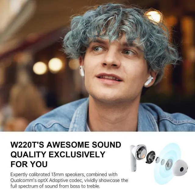 Upgrade your audio experience with the Edifier W220T True Wireless Earbuds and immerse yourself in superior sound quality wherever you go. Equipped with cutting-edge Bluetooth version 5.3 technology, these wireless Bluetooth earphones ensure seamless connectivity and stable transmission for an uninterrupted listening experience. Immerse yourself in premium sound quality thanks to the 13mm diaphragm drivers and Qualcomm's aptX Adaptive codec, delivering rich, detailed sound across all frequencies. Whether you're listening to music or taking calls, enjoy crystal-clear audio with enhanced depth and clarity. Stay connected on the go with the 4 built-in cVc environment noise-canceling microphones, strategically placed on each earbud.