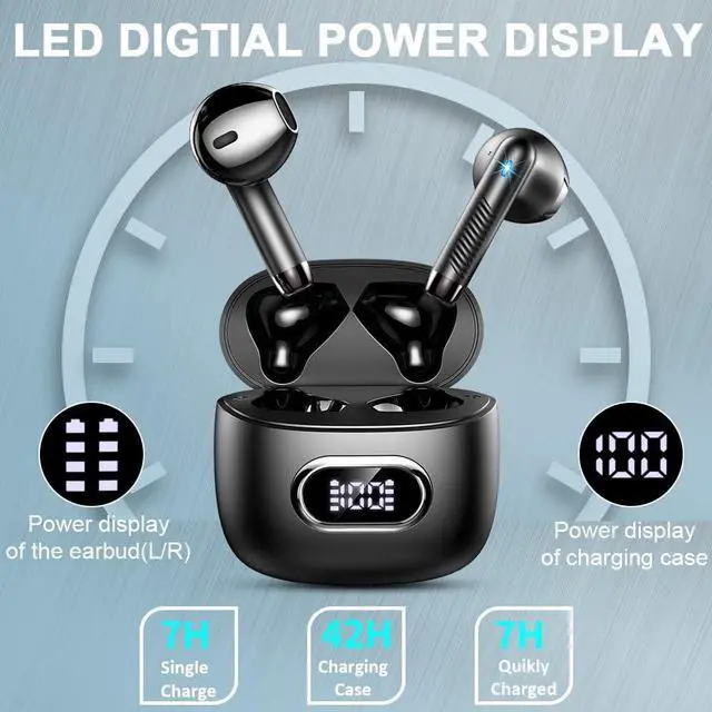 Playtime: Earphones wireless with dual digital power display, easy to know the remaining power of headphones bluetooth wireless and case while open or close the case. 6-8 hours of listening time for a single charge and another 5 time recharges from the charging case extend the listening time up to 42 hours. Enjoy fast charging, Just charge 10 minutes, get up to 1 hour of playtime.
