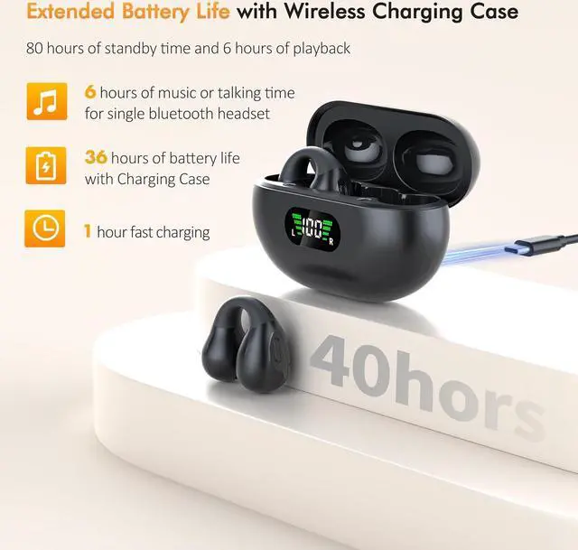Charging Case with LED DisplayThe 300mAh charging case supports 12-15 full charges for the wireless earbuds, and the standby time is up to 80 hours when fully charged, allowing you to enjoy more than 36 hours of music time. Each earbud provides 6 hours of playback on a single charge. The case is Type-C compatible. The LED power display shows the charging status of the earphones and charging case.