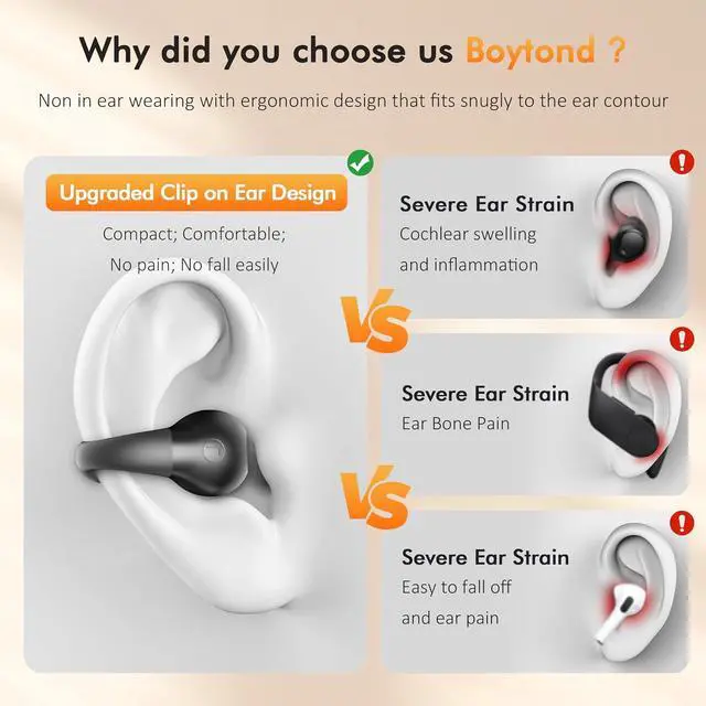 Clip-EarNewly developed clip-on ear design with new and stylish appearance and open-ear to make sure you can sense the sound of the external environment when you enjoy your music, film, sport. And you Improve personal safety and be able to respond politely to others.