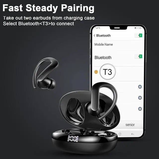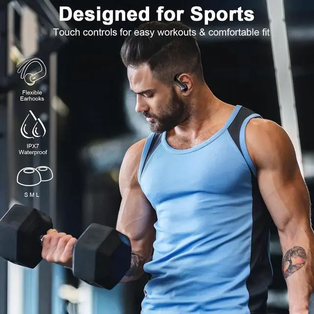 Designed for Sports & IPX7 Waterproof. The true wireless earbuds feature flexible and secure-fit ear hooks and come with 3 sizes of ear tips (S, M, L) for a perfect fit that remains snug and comfortable. With wireless headphones Bluetooth, you won't be worry of them falling out while you're on the go. Perfect for camping, running, or working out. IPX7 waterproof can effectively prevent the earbuds wireless Bluetooth from damage of sweat and raindrops.