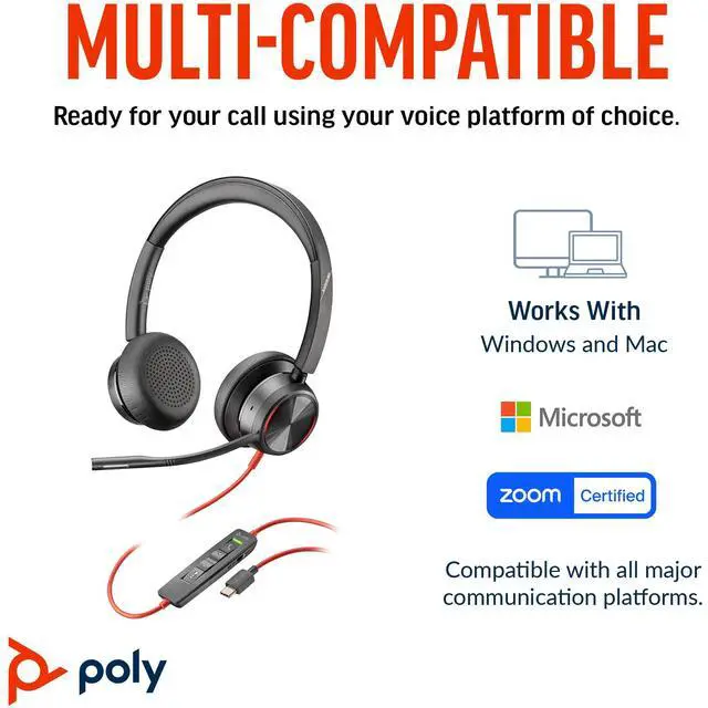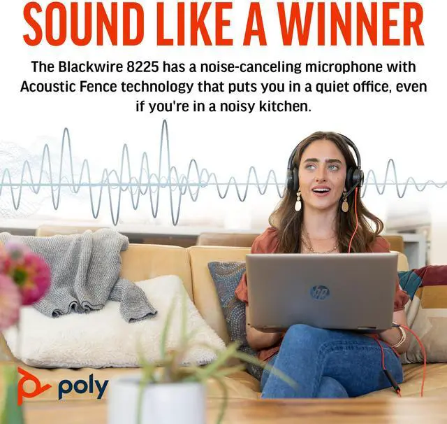 Stay distraction-free on calls Is background noise affecting your productivity? Reduce noise and increase focus with the Poly Blackwire 8225 headset with a noise canceling microphone enhanced with Acoustic Fence technology and advanced hybrid active noise canceling (ANC). Sound like a winnerWith the Blackwire 8225, your voice is the only thing heard, not the chaos around you. Its noise-canceling microphone with Acoustic Fence technology puts you in a quiet office, even if you're in a noisy kitchen. Long-lasting comfortThe Blackwire 8225 is crafted from premium materials with a lightweight design. You will get a comfortable, customized Fit using adjustment markers and 180° pivoting speakers.