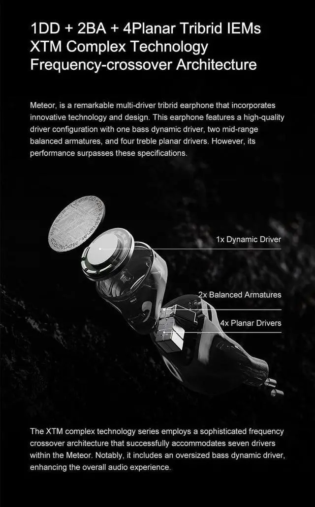 1DD+ 2BA+4Planar Tribrid lEMs XTM Complex Technology Frequency-crossover Architecture Meteor, is a remarkable multi-driver tribrid earphone that incorporates innovative technology and design. This earphone features a high-quality driver configuration with one bass dynamic driver, two mid-range balanced armatures, and four treble planar drivers. However, its performance surpasses these specifications.