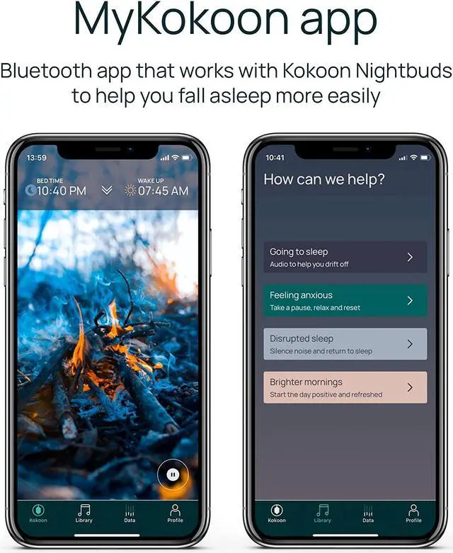 MYKOKOON APP: Our easy-to-use App includes an audio library providing sleep techniques and meditation exercises used in Cognitive Behaviour Therapy. The relaxing audio and sleep music can help you fall asleep faster and relax more easily. The sensors in the Nightbuds share your sleep data with the app and provide you with insights such as time spent asleep time it took to fall asleep and your overall sleep efficiency score. Its up to you whether you use and keep track of this info or not.
