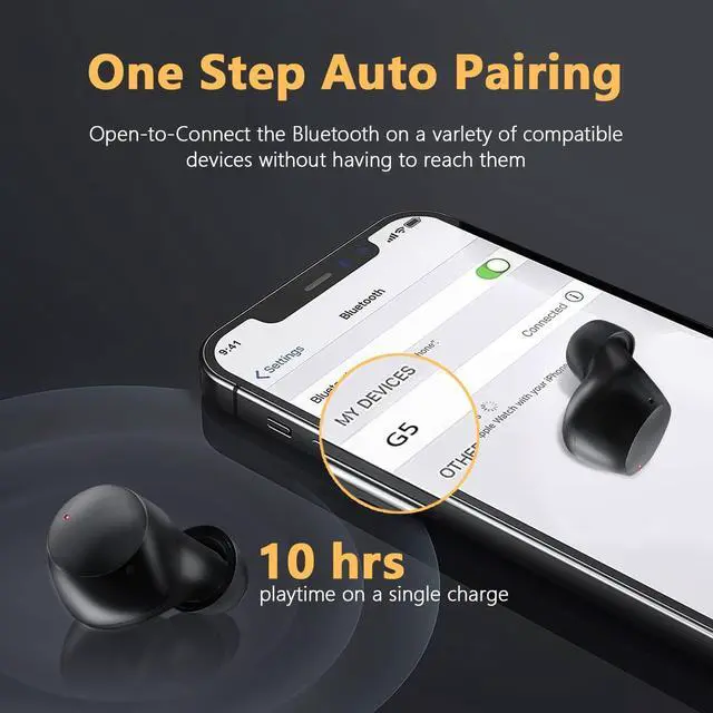 ONE Step Pairing & Smart Touch Control: Pick up earbuds from the charging case and close the case. enter the Bluetooth setting of the phone, and connect the earbuds "G5", They will automatically connect later. The sensitive multi-function touch control allows you complete control over the earbuds and device connected through simple taps, play/pause, adjust volume, skip songs, answer & end calls.