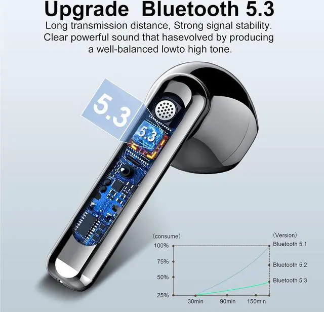 Seamless Pairing: Our wireless earbuds Adopt brand new Bluetooth 5.3 technology, providing an impressive 15-meter ultra-wide range and a robust connection, with transmission speeds reaching 48 Mbit/s. This means our earbuds not only offer an incredibly stable signal but also deliver enhanced sound quality and reduced power consumption. After the initial setup, reconnecting your bluetooth earphones is as simple as opening the charging case. It's effortless and lightning-fast.