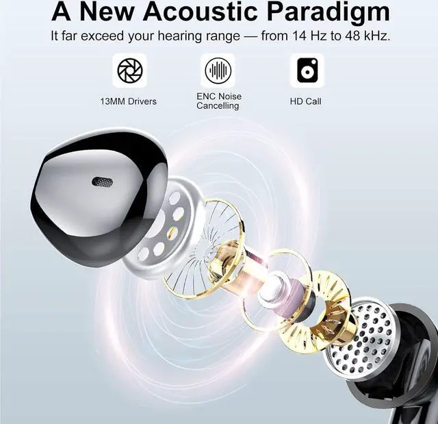 Immersive Stereo Sound and Superior Clear Call: These wireless headphones boast a 13mm speaker and a triple-layer composite diaphragm, enhanced with AAC/SBC audio coding technology, to provide rich bass, crisp highs, and precise mids. The earbuds wireless bluetooth are equipped with four microphones and ENC (Environmental Noise Cancellation) technology, which effectively eliminates 85% of background noise during calls, ensuring a crystal-clear calling experience.