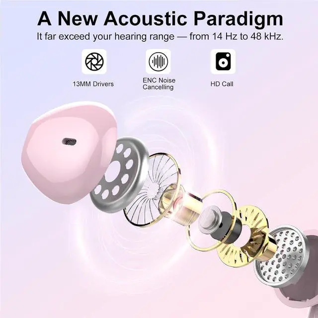 Immersive Stereo Sound and Superior Clear Call: These wireless headphones boast a 13mm speaker and a triple-layer composite diaphragm, enhanced with AAC/SBC audio coding technology, to provide rich bass, crisp highs, and precise mids. The earbuds wireless bluetooth are equipped with four microphones and ENC (Environmental Noise Cancellation) technology, which effectively eliminates 85% of background noise during calls, ensuring a crystal-clear calling experience.