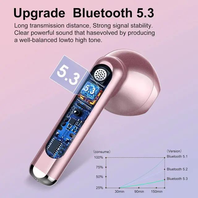 Seamless Pairing: Our wireless earbuds Adopt brand new Bluetooth 5.3 technology, providing an impressive 15-meter ultra-wide range and a robust connection, with transmission speeds reaching 48 Mbit/s. This means our earbuds not only offer an incredibly stable signal but also deliver enhanced sound quality and reduced power consumption. After the initial setup, reconnecting your bluetooth earphones is as simple as opening the charging case. It's effortless and lightning-fast.