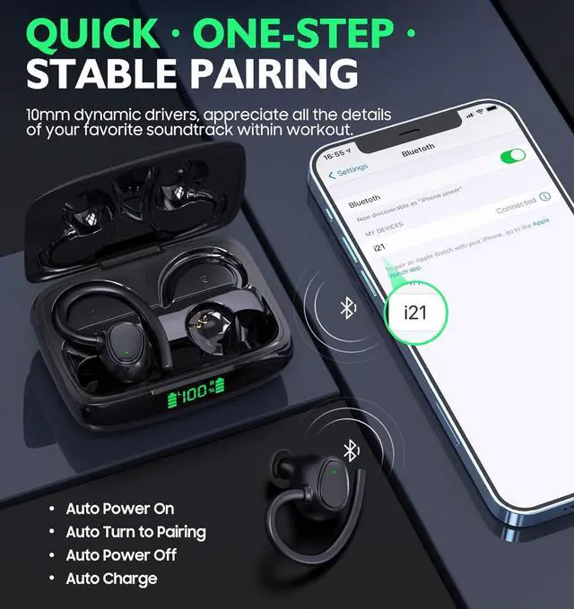 Quick Pairing & Touch Control -- Taking wireless earbuds out of the case and they will automatically pair and connect with themselves. Activate bluetooth function and search for "i21". After the first successful connection, the wireless earbuds with microphone will automatically connect to the last paired device when reboot. Round shape touch sensors are well-designed on the back of the bluetooth headset, making it easier to operate blindly for phone call, volume control, Siri, etc.
