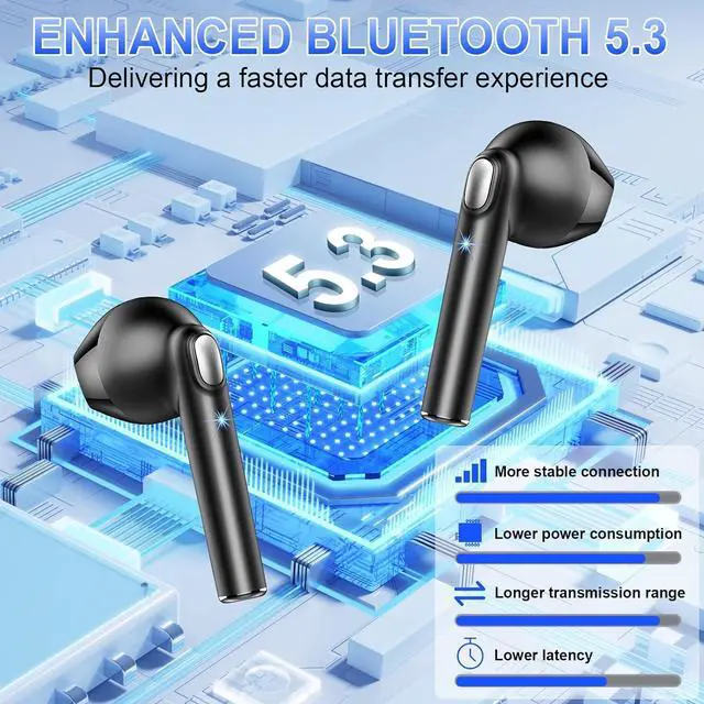 New Bluetooth 5.3: Bluetooth technology and dual-channel transmission ensure a lightning-fast and ultra-stable connection, enabling a seamless and immersive experience without obstacles within a range of 15 meters. Compared with the previous generation 5.2, the 5.3 version of the wireless earbuds has less delay, lower power consumption and less noise. At the same time, it can also automatically shut down and charge after putting it back into the charging box.