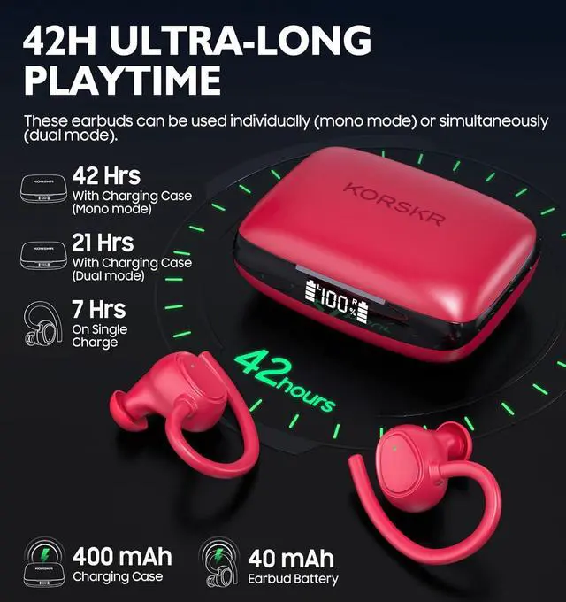 LED Power Display & Up to 42H Playtime -- Only 1.2 hrs of charging time is required for the true wireless earbuds and 1.6 hrs for charging case to get fully charged. One single charge keeps the earbuds serving for 7hrs and extend to 42hrs with the charging case (in mono mode). These earbuds can be used individually (mono mode) or simultaneously (dual mode). The wireless earbuds with dual digital power display tells the remaining battery in percentage.