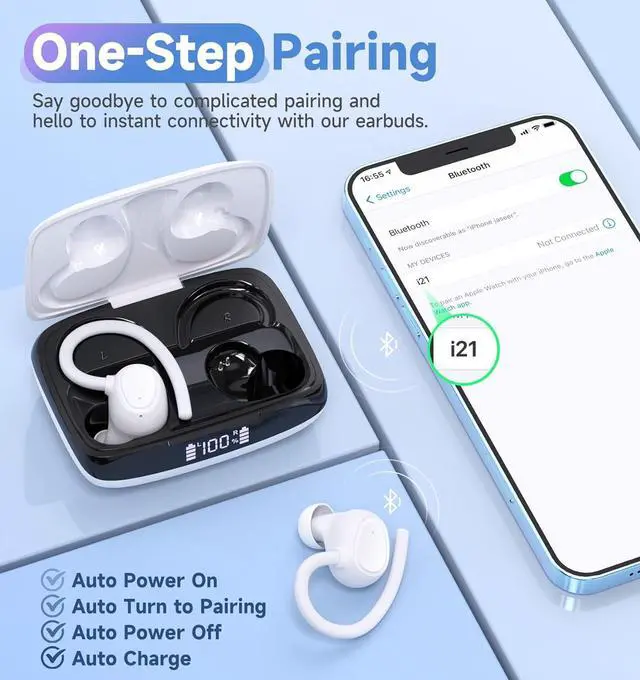 Quick Pairing & Touch Control -- Taking wireless earbuds out of the case and they will automatically pair and connect with themselves. Activate bluetooth function and search for "i21". After the first successful connection, the wireless earbuds with microphone will automatically connect to the last paired device when reboot. Round shape touch sensors are well-designed on the back of the bluetooth headset, making it easier to operate blindly for phone call, volume control, Siri, etc.