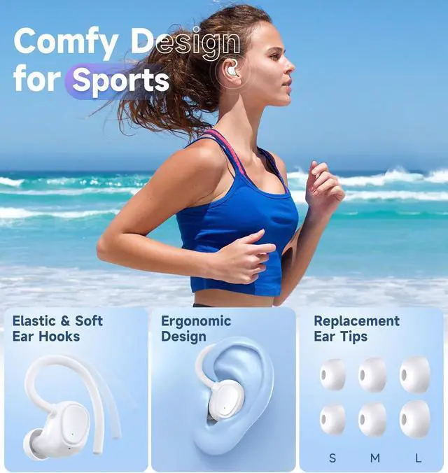 Ergonomic Design for Sports -- Unshakable and comfortable fit ear hooks and ergonomic shape make the wireless earbuds stay firmly in position with no pain while sports. Comes with 3 different sized eartips that fit snugly and comfy in the ears. The wireless earbuds will never fall off even do strenuous endurance training. Featured with its IPX6 coating, our wireless earphones are built for any lifestyle. Go ahead and wear them running in the rain, working out at the gym, cycling, or hiking.