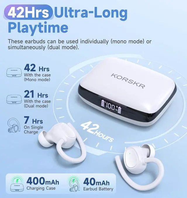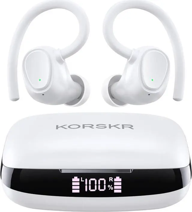 KORSKR Wireless Earbuds Bluetooth 5.3 Ear Buds 42Hrs Playtime Bluetooth Headphones with Charging Case Stereo Bass Over-Ear Earphones with Earhooks Built-in Mic Waterproof Headset for Sports White