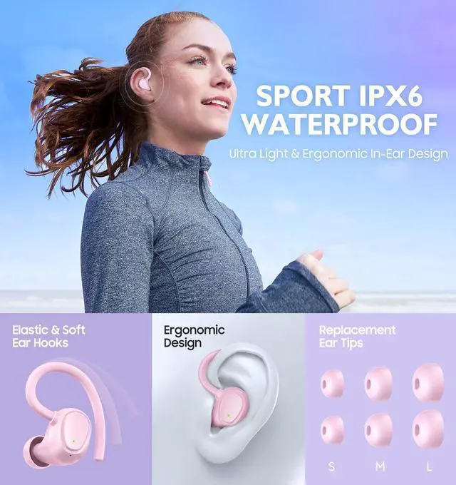 Ergonomic Design for Sports -- Unshakable and comfortable fit ear hooks and ergonomic shape make the wireless earbuds stay firmly in position with no pain while sports. Comes with 3 different sized eartips that fit snugly and comfy in the ears. The wireless earbuds will never fall off even do strenuous endurance training. Featured with its IPX6 coating, our wireless earphones are built for any lifestyle. Go ahead and wear them running in the rain, working out at the gym, cycling, or hiking.