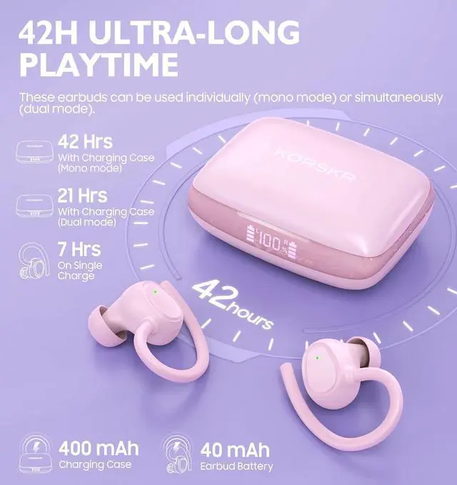 LED Power Display & Up to 42H Playtime -- Only 1.2 hrs of charging time is required for the true wireless earbuds and 1.6 hrs for charging case to get fully charged. One single charge keeps the earbuds serving for 7hrs and extend to 42hrs with the charging case (in mono mode). These earbuds can be used individually (mono mode) or simultaneously (dual mode). The wireless earbuds with dual digital power display tells the remaining battery in percentage.