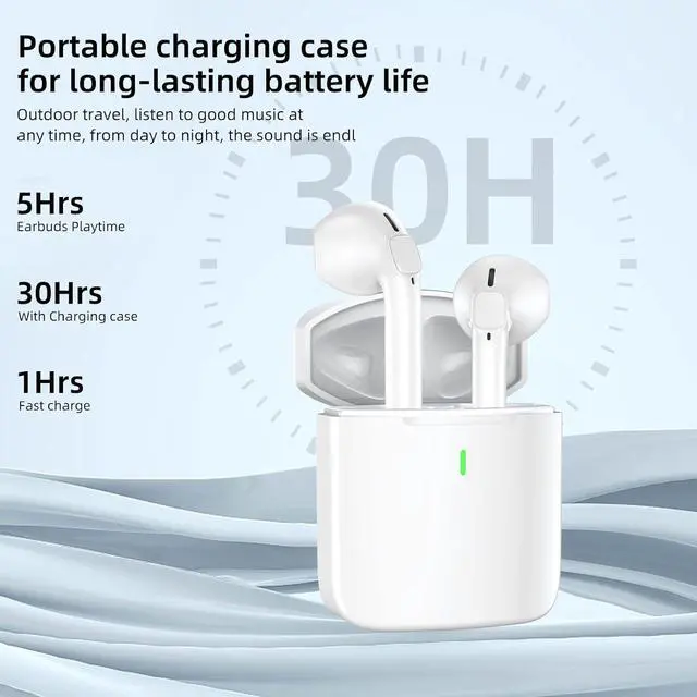 IPX7 waterproof and 30 Hours PlaytimeIn-ear earbuds feature IPX7 nano-coating technology to withstand everyday spills, sweat and rain. A single charge provides 5 hours of use, while the charging case extends battery life to 30 hours. Perfect for running, hiking or traveling.