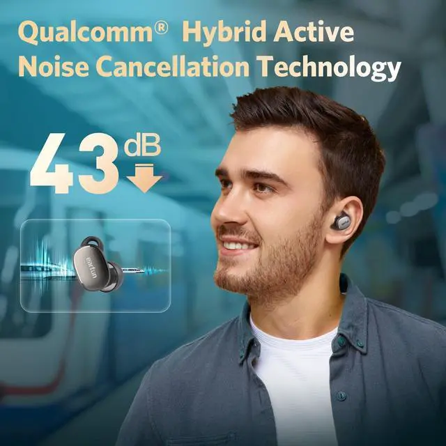 [Active Noise Canceling up to 43dB] Experience active noise cancellation with EarFun's QuietSmart 2.0 ANC technology that reduces noise by up to 43 dB. Freely switching between three modes (ANC / Ambient Sound / Normal) with one button allows you to immerse yourself in your own world no matter your environment.