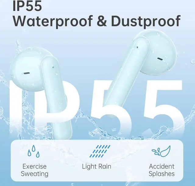 IP55 Waterproof and Dustproof Ear BudsThe wireless ear buds have IP55 waterproof and dustproof functions. When you running in the rainy or fitness with sweat a lot, when you work in an environment with a lot of dust, earbuds always work well and keep clean, but not support swimming.