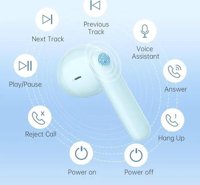 Smart Touch Control Earbuds BluetoothEasy touch control via earbuds: Turn on/Turn off; Play/Pause; Previous/Next; Answer/Hang up/Refuse call; Wake up Siri; Music/Game Mode. Just keep your phones in pocket and touch the LED area to control call or music, so convenient when you are working or running, fitness.