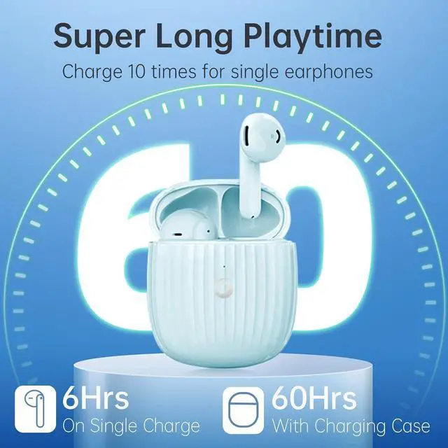 60H Playback True Wireless EarbudsEach earbuds can last 6H on a single charge, the charging case with 400mAh battery capacity can provide 6 times full charging for both earbuds, so this true wireless earbuds can been listen for 60 hours long with take turn.
