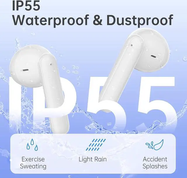IP55 Waterproof and Dustproof Ear BudsThe wireless ear buds have IP55 waterproof and dustproof functions. When you running in the rainy or fitness with sweat a lot, when you work in an environment with a lot of dust, earbuds always work well and keep clean, but not support swimming.