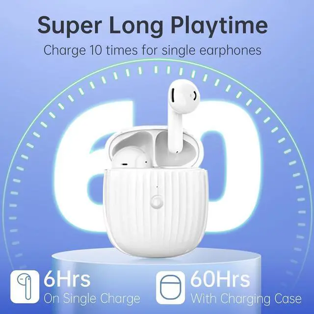 60H Playback True Wireless EarbudsEach earbuds can last 6H on a single charge, the charging case with 400mAh battery capacity can provide 6 times full charging for both earbuds, so this true wireless earbuds can been listen for 60 hours long with take turn.