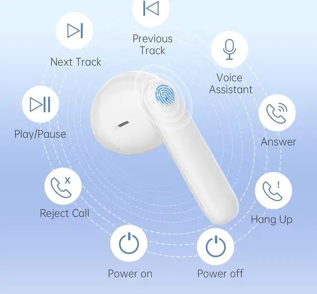 Smart Touch Control Earbuds BluetoothEasy touch control via earbuds: Turn on/Turn off; Play/Pause; Previous/Next; Answer/Hang up/Refuse call; Wake up Siri; Music/Game Mode. Just keep your phones in pocket and touch the LED area to control call or music, so convenient when you are working or running, fitness.