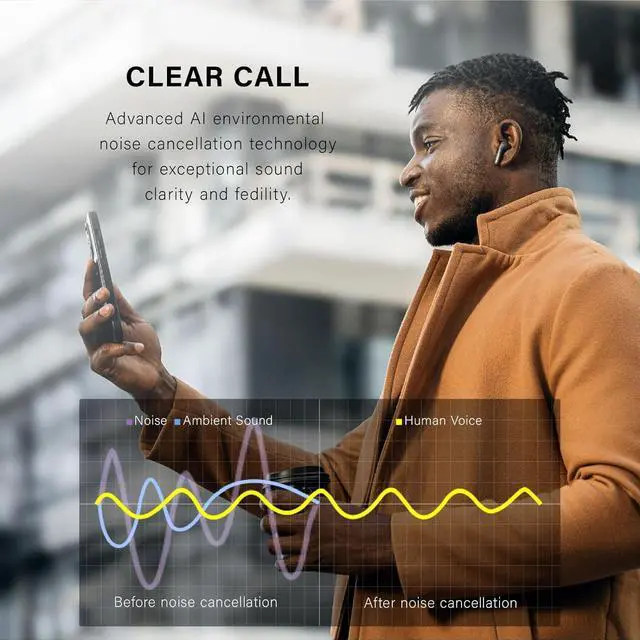 ADVANCED AI ENVIRONMENTAL NOISE CANCELLING Stay focused on your calls with AI environmental noise cancelling, ensuring crystal clear voice transmission even in noisy environments.