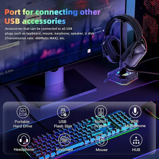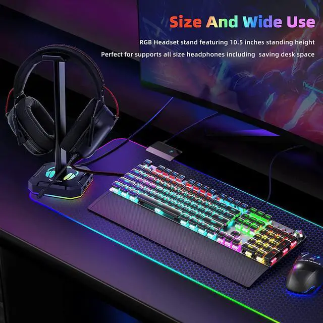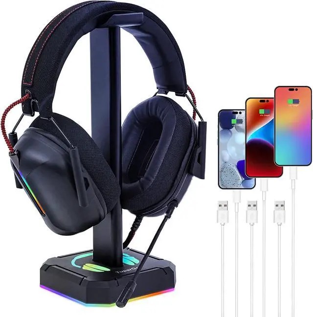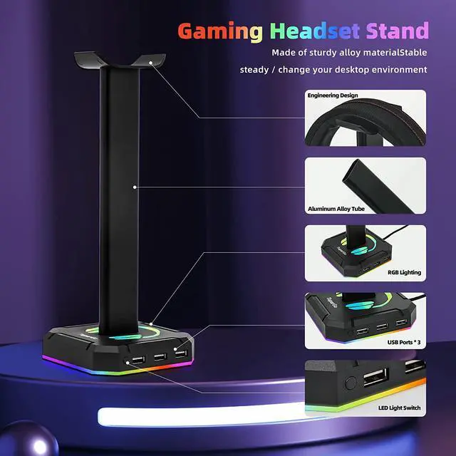 Headphone Stand RGB Lights Gaming Headset Holder with 3 USB Port for Charging or Connecting Headset Keyboard and Mouse,9 Modes Can be Toggles and Off,Aluminium Connecting Rod.