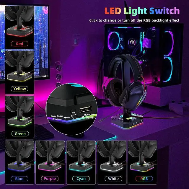 This headphone holder features 9 kinds of lighting modes, specialy the multi-color flowing and single-color breathing mode, One button for easily selecting light mode and turn off. God said, "Let there be light," and there was light.