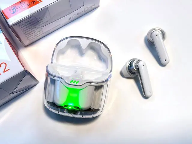 Trendy Clear Case Design: Features a modern transparent charging case that showcases the earbuds inside, combining tech appeal with a minimalist style for a standout look.