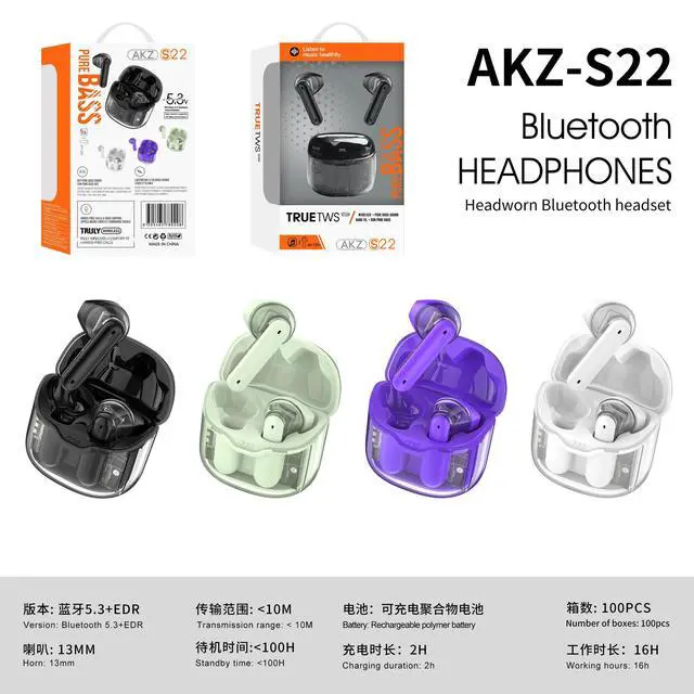 AKZ S22 Transparent Case TWS Bluetooth Earbuds, 2024 Wireless In-Ear Earphones with Clear Shell Design, 40H Playtime, Type-C Fast Charging, HiFi Stereo Sound for Sports Travel white