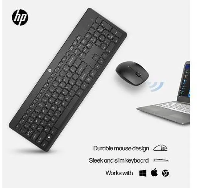OverviewExperience a keyboard and mouse combo thats comfortable, sleek and quiet. Now you can be at your most efficient with the least amount of noise. Plus, with keyboard shortcuts and long-lasting batteries, you can stay productive all day long. What's in the box? Keyboard; Mouse; Product Notice; Warranty Card; R. E. D. RTF CardDisclaimers Wireless connectivity up to 32.8 ft (10m). Actual battery life will vary with use and environmental conditions, and will naturally decrease with time and usage. HP includes a two-year limited warranty with online support available 24x7.